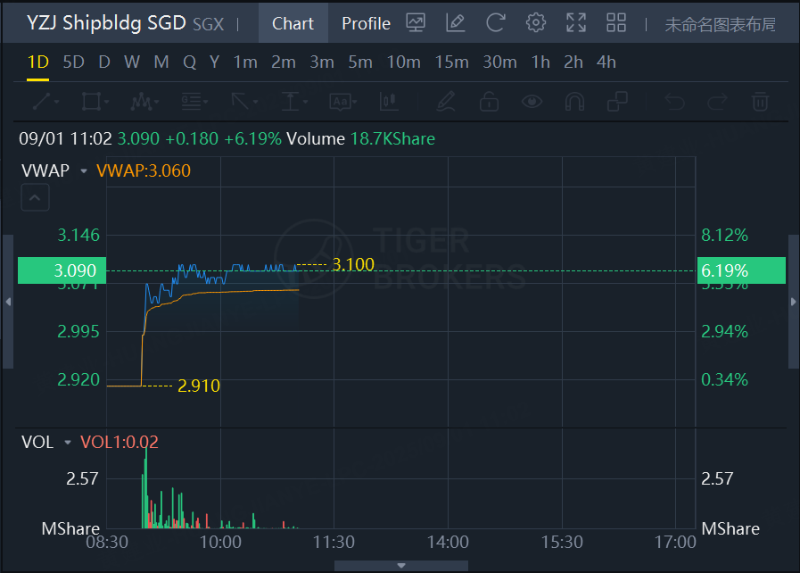 YZJ Shipbldg SGD jumps 6.19% at 11:02 am, Sep 1.