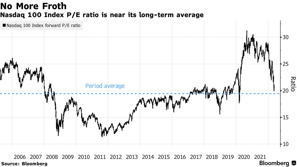 以科技股为主的纳斯达克100指数较去年的峰值下跌了近30%,连续7周录得下跌,创自2011年以来最长的连跌。这使得其估值看起来更有吸引力。