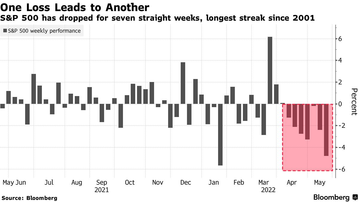 美股连续七周下跌,上周五标普500指数一度下跌多达2.3%,五个月内下跌超过20%,险熊市收盘的风险。然而,买家在最后一小时突然涌入,使其自1月3日以来的跌幅收窄至18.7%,再次避免跌入熊市。这让华尔街的预言家们像回到新冠疫情爆发初期一样,对美股的走势越来越摸不着头脑。