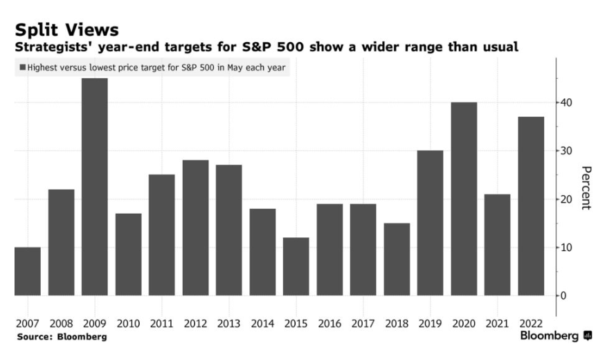 结果就是,华尔街的预测结果大相径庭。本月又有六位策略师下调了对标普500指数的年终预期,目前最高和最低预测之间的差距达到了37%。在过去十年的同期,这种巨大的分歧只出现过一次:就在2020年3月的抛售之后。