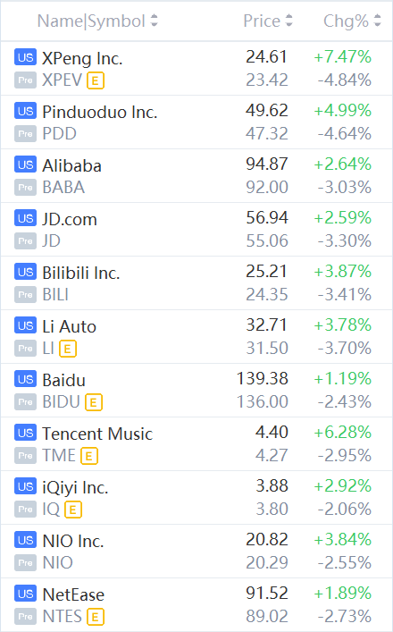 Alibaba, Baidu, Bilibili, iQiyi, JD.com, Nio, Li Auto, NetEase, Pinduoduo, and Xpeng fell between 2% and 5%.