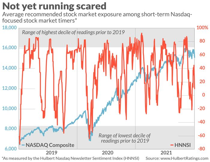 Consider another sentiment measure that my firm maintains, which reflects the average recommended equity exposure among short-term Nasdaq-focused stock market timers. This average is plotted in the accompanying chart of the Hulbert Nasdaq Newsletter Sentiment Index, or HNNSI.