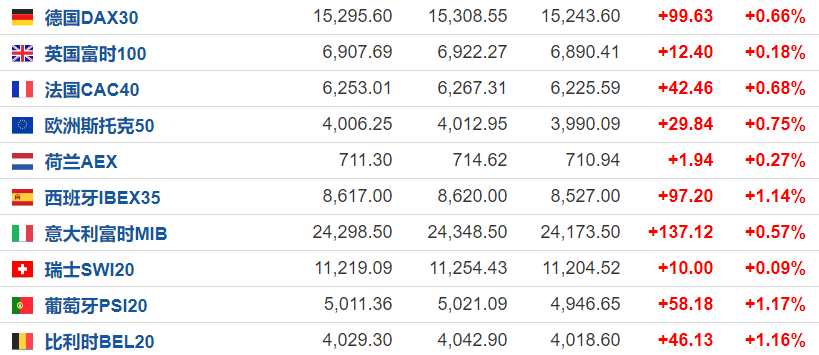欧洲主要股指集体上涨,截至发稿,德国DAX30指数涨0.66%,英国富时100涨0.18%、法国CAC40涨0.68%。原油