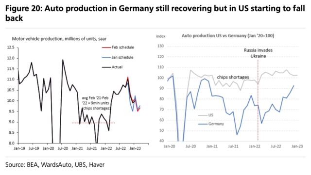 瑞银指出,在疫情间,因芯片的短缺汽车生产也受到了限制,因此,随着芯片库存的改善,在美国,汽车产量猛增到疫情前的水平,但现在已开始下滑。在欧洲,由于芯片短缺现象持续的时间比美国长,所以复苏的时间晚于美国,但从8月开始,生产也开始大幅恢复: