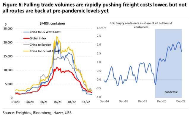 瑞银认为,对于货物需求量的下降使得此前需求不平衡的现象得到了改善。出口量的下降使货运成本承压,但并不是所有的路线的成本都已下降至疫情前的水平: