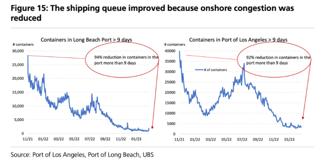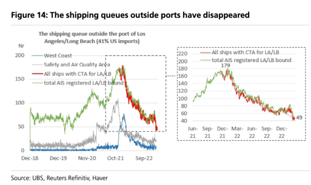 洛杉矶和长滩港(占美国进口的41%)的拥堵情况已经完全消失。自2021年6月以来轮船装载卸货需要排队的现象已经消失(自1月初以来减少了120多艘集装箱船),东海岸港口的拥堵情况也已不存在。