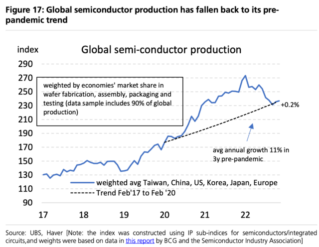 从半导体行业来看,瑞银指出,该行业的供应增加叠加需求下降 ,使得交货时间不断提前,也使其库存开始大幅回升: