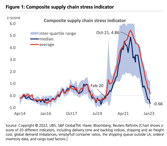 瑞银经济学家Arend Kapteyn领导的团队在2月24日的报告中指出,随着需求不平衡现象的改善,航空、船运成本的下降等因素,全球供应链瓶颈正逐步缓解,其压力为10年来的最低水平,报告称: