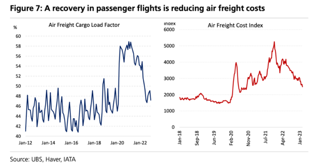 瑞银指出,从空中运输来看,客运航班量的恢复正在降低航空货运成本,根据国际航空运输协会的航空连通性指数示,全球航班已复到疫情前的74%左右,但可用航空货运吨数仍比2019年的水平低8.2%,因需求疲软,导致货机量环比下降:
