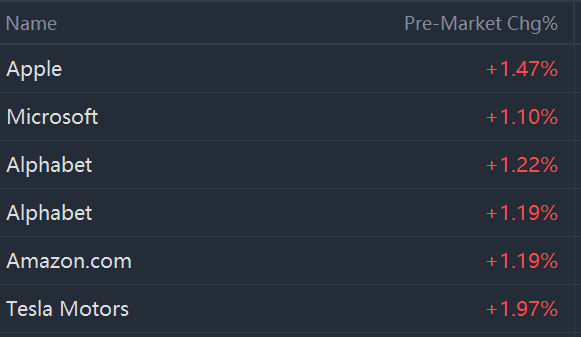 Megacap growth companies including Apple, Amazon, Microsoft, Alphabet and Tesla rose between 1% and 2% in premarket trading.