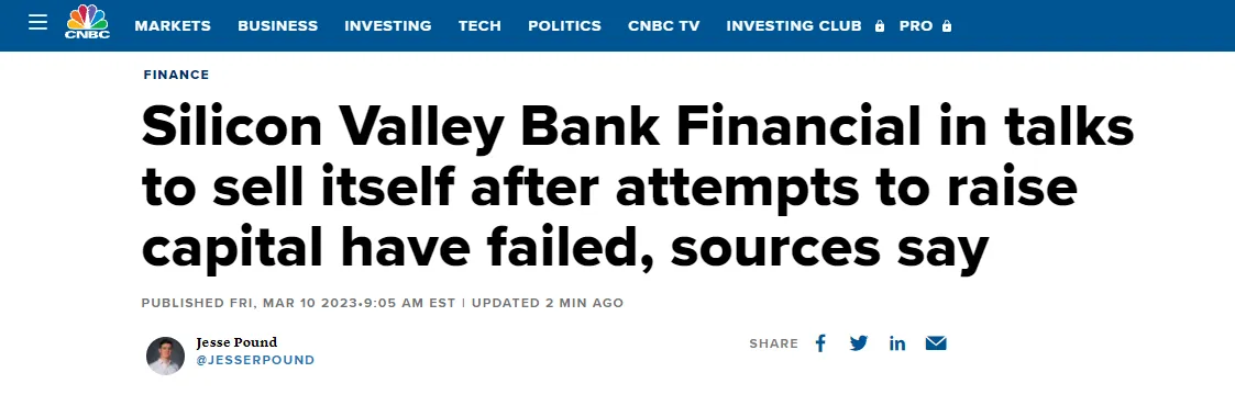 3月10日,CNBC刚刚报道,硅谷银行金融集团的筹资努力已失败,正磋商出售。