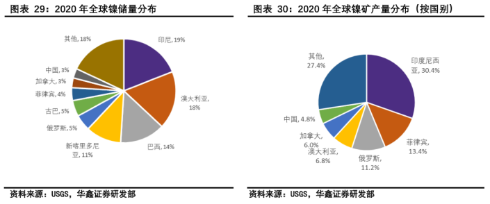 镍方面,据华鑫证券研报数据,全球镍资源主要分布在印尼、澳大利亚、巴西等地,中国镍矿资源短缺,储量仅占全球的3%。产量上看,全球镍主要生产国有印尼、菲律宾、俄罗斯等,其中印尼和菲律宾合计占比达到44%,而中国的镍矿产量仅占4.8%。