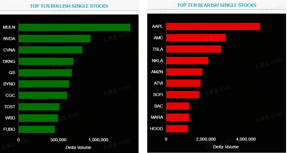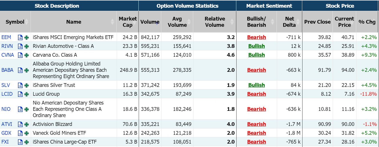 This report shows stocks with the highest volume of bullish and bearish activity by option delta volume, which converts option volume to an equivalent stock volume (bought or sold).