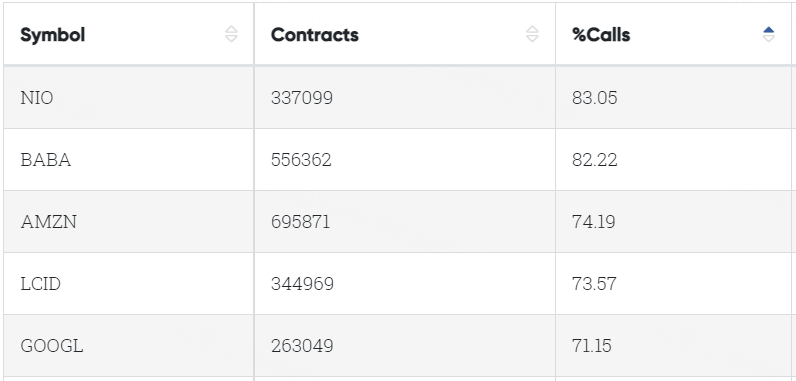 Special %Calls >70%: Nio; Alibaba; Amazon; Lucid; Alphabet