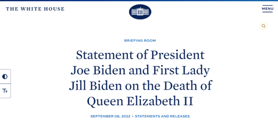 据白宫官网,美国总统乔·拜登和第一夫人吉尔·拜登就英国女王伊丽莎白二世去世发表声明。