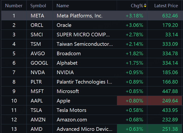 Big tech stocks mostly jumped on Thursday. Meta, Oracle up over 3%; SMCI, TSMC, Broadcom, Alphabet up around 2%; Nvidia up nearly 1%.