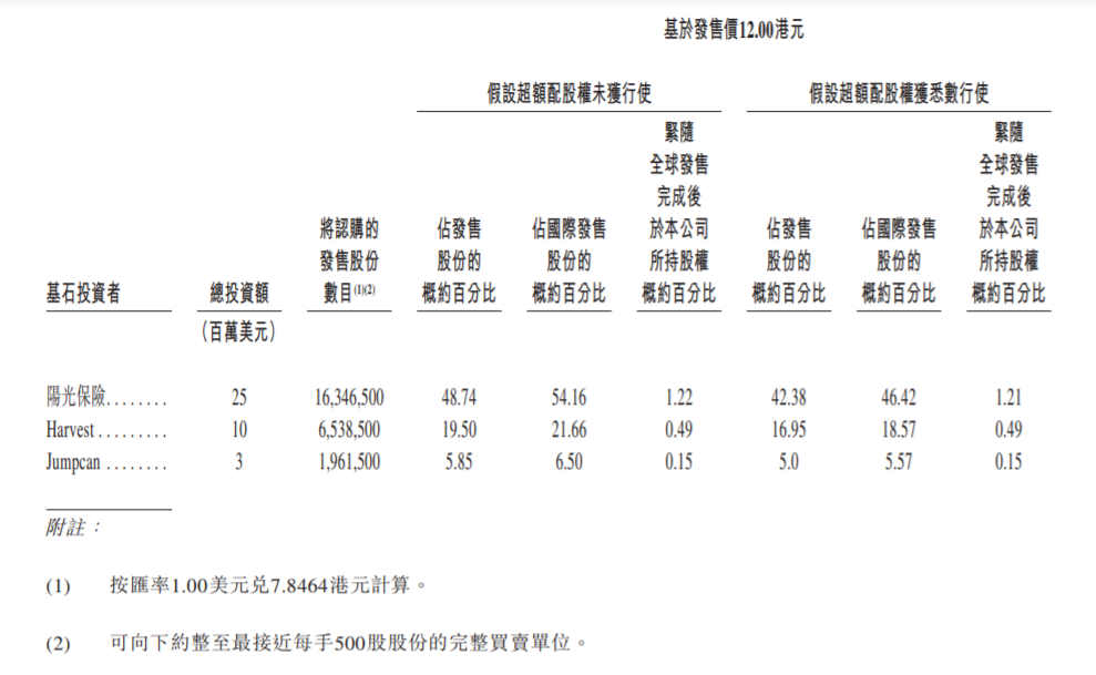 集团已订立基石投资协议,据此,在若干条件的规限下,基石投资者已同意按发售价认购总金额3800万美元(或约2.98亿港元)可购买的有关数目的发售股份。基石投资者按发售价12.00港元将予认购的发售股份总数为2484.65万股,相当于全球发售发售股份的约74.09%及紧随全球发售完成后(假设超额配股权未获行使)集团已发行股本总额的约1.85%。 基石投资者包括阳光保险、Harvest及Jumpcan。