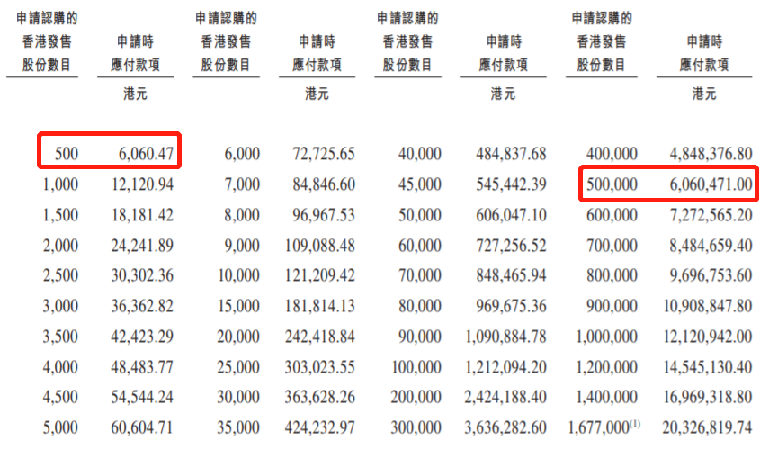 乙组门槛为50万股,申购所需资金约6060471港元。