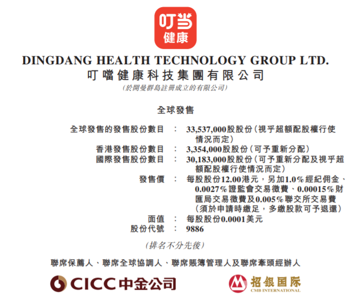9月1日,叮当健康发布公告,公司全球发售3353.7万股股份,其中香港发售股份335.4万股,国际发售股份3018.3万股,另有15%超额配股权;2022年9月1日至9月6日招股;发售价将为每股发售股份12.00港元,每手买卖单位500股,入场费约6060.47港元;中金公司及招银国际为联席保荐人;预期股份将于2022年9月14日于联交所主板挂牌上市。