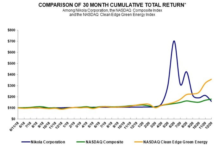 将Nikola的股价表现与市场相比,也能够明显反映出这家公司被投资者热捧后又遭抛弃的趋势,以投资100美元为例,如果投资于Nikola,到2020年6月回报高达700美元,如果投资于纳斯达克综合指数或纳斯达克绿色能源板块,仅增值不到200美元,但随后继续持有Nikola将会明显跑输大盘和相关板块。