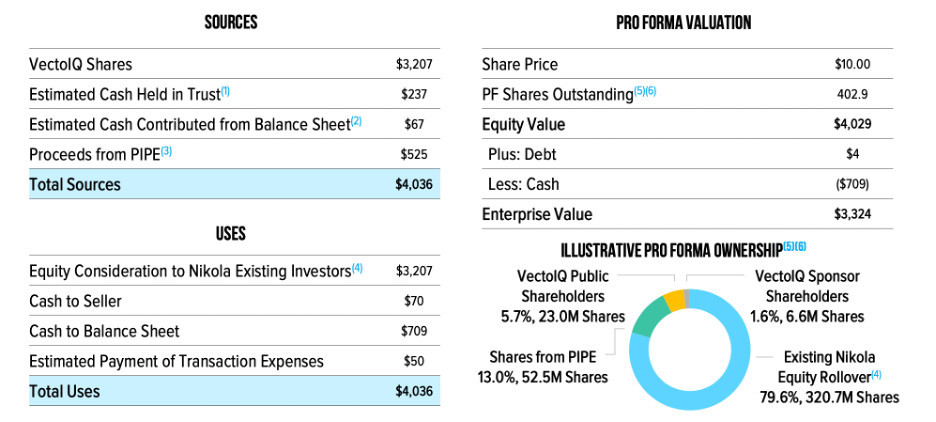 根据Nikola当时所披露的交易信息显示,VectoIQ提供了此前上市时所募集的2.3亿美元,占股份比例为5.7%,Nikola现有股东占股份比例为79.6%,按照每股10美元计算,当时合并估值约为40亿美元。