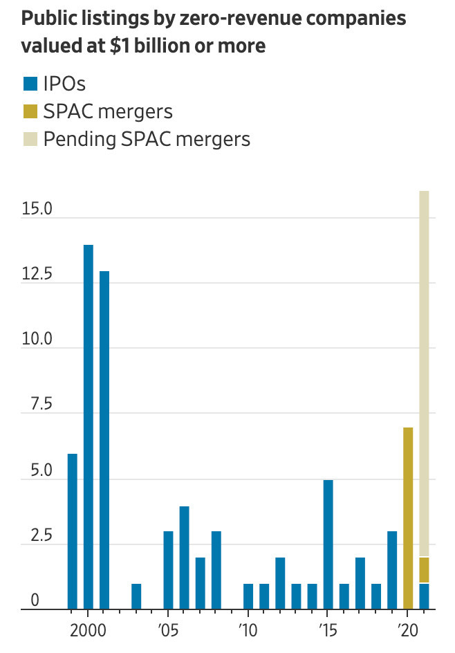 据一份统计数据显示,通过SPAC完成上市的初创公司2020年营业收入中位数为4800万美元。据《华尔街日报》数据统计,零收入上市估值超过10亿美元的公司,通过SPAC完成的已经超过传统IPO的数量,并且已经宣布并且尚未完成中的数量更多。