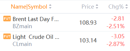 The ICE August Brent futures contract was down $3.57/b (3.19%) from the previous close at $108.17/b, while the NYMEX August light sweet crude contract fell $3.05/b (2.87%) at $103.14/b.