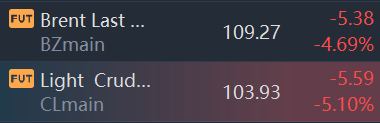 By 2:55 a.m. ET, U.S. West Texas Intermediate (WTI) crude futures were down $5.59, or 5.1%, to $103.93 a barrel. Similarly Brent crude futures dropped $5.38, or 4.7%, to $109.27 a barrel.