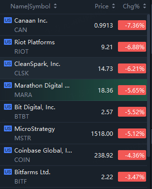 Riot Platforms down 7%; Marathon Digital down 6%; Microstrategy down 5%; Coinbase Global down 4%; Bitfarms down 3.5%.