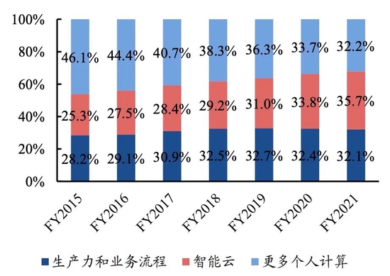 如今扛起收入大旗的是来自云计算的另外两大业务——“生产力与业务流程”部门、“智能云”部门。