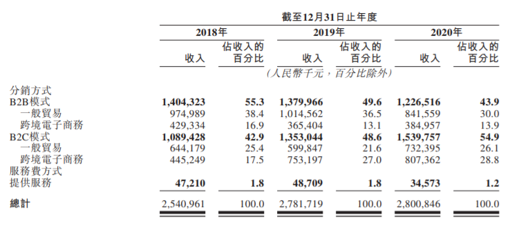 在分销方式下,公司向选定的品牌合作伙伴购买产品,管理中国及跨境供应链,通过全渠道营销识别及接触目标客户,并通过公司所经营的网店向客户出售产品(公司称之为企业对客户(B2C)模式),或向电子商务平台或其他分销商出售产品,该等电子商务平台或分销商将产品售予客户(公司称之为企业对企业(B2B)模式)。