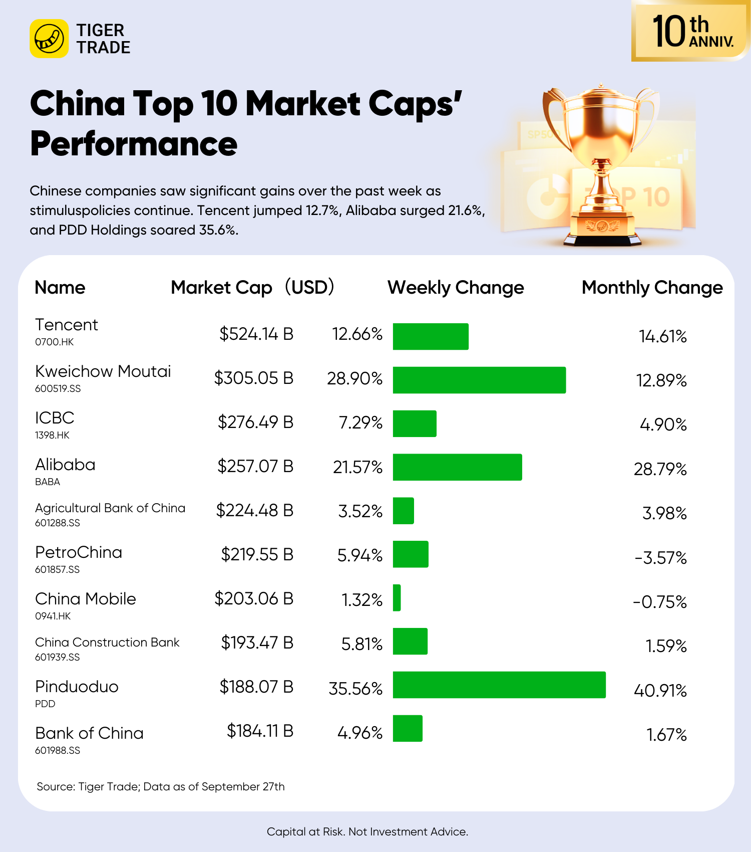 Chinese companies saw significant gains over the past week as stimuluspolicies continue. Tencent jumped 12.7%, Alibaba surged 21.6%, and PDD Holdings soared 35.6%.