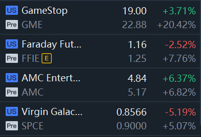 GameStop rose 20%; Faraday Future rose 8%; AMC rose 7%; Virgin Galactic rose 5%.