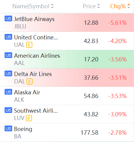 Delta Air Lines,United Continental, JetBlue Airways and Southwest Airlines slid between 3% and 6%.