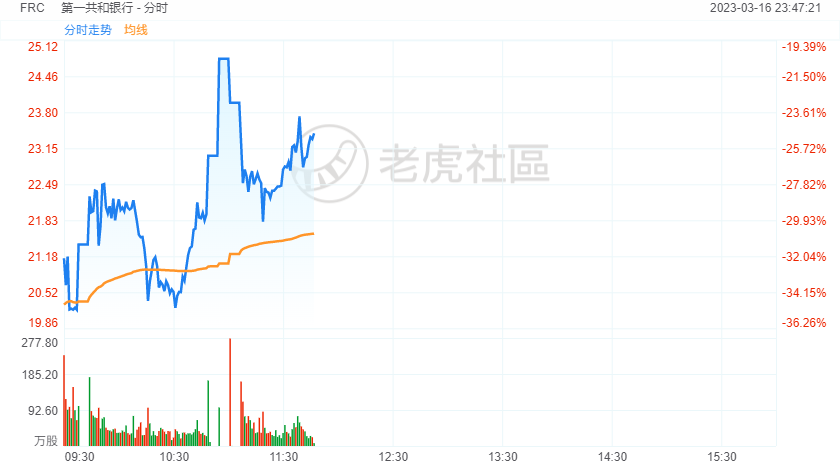 周四,第一共和银行跳空低开逾30%,但盘中跌幅收窄,截至发稿,跌幅约25%。早盘有媒体报道称,包括摩根大通与摩根士丹利在内的多家大银行正商谈达成挽救第一共和银行的协议,可能对该行大幅注资。