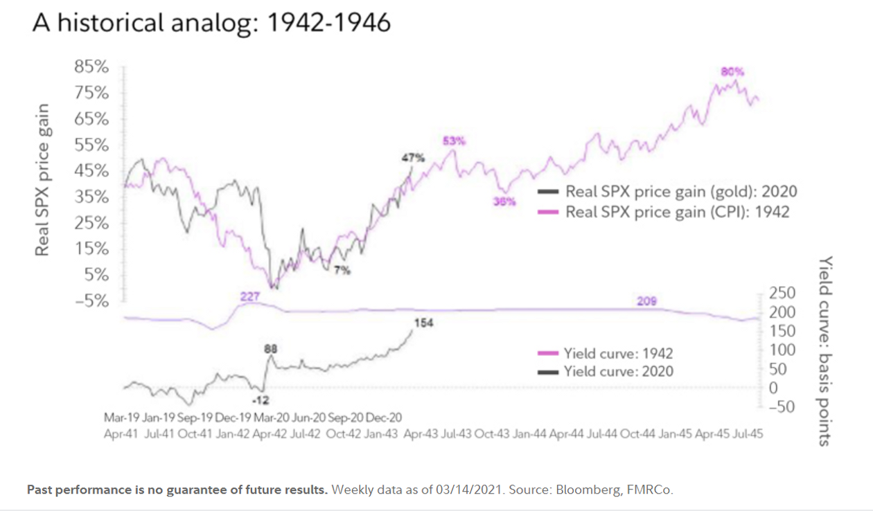 But another historical analog is the 1941 to 1946 period. To mobilize against World War II, federal debt tripled, the Fed’s balance sheet swelled by 10-fold and the Fed capped both short- and long-dated interest rates below the rate of inflation. Granted, the current playbook isn’t quite that aggressive — the Congressional Budget Office’s forecast for the national debt in 2030 is only 6% higher than it was before the COVID-19 pandemic — but directionally it is similar.