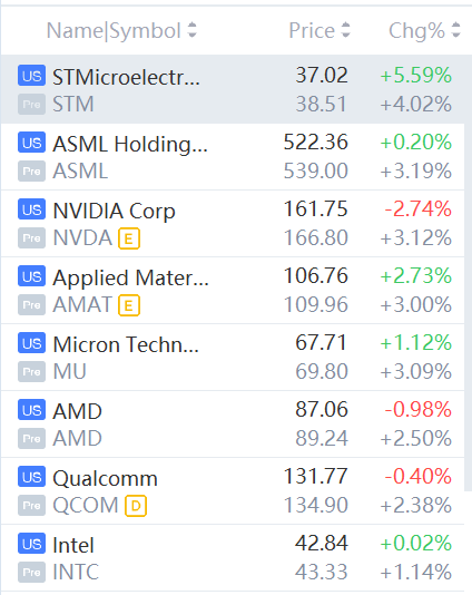 STM, Applied Materials, AMD, Nvidia, ASML, Qualcomm, Intel, Micron Technology climbed between 1% and 4%.