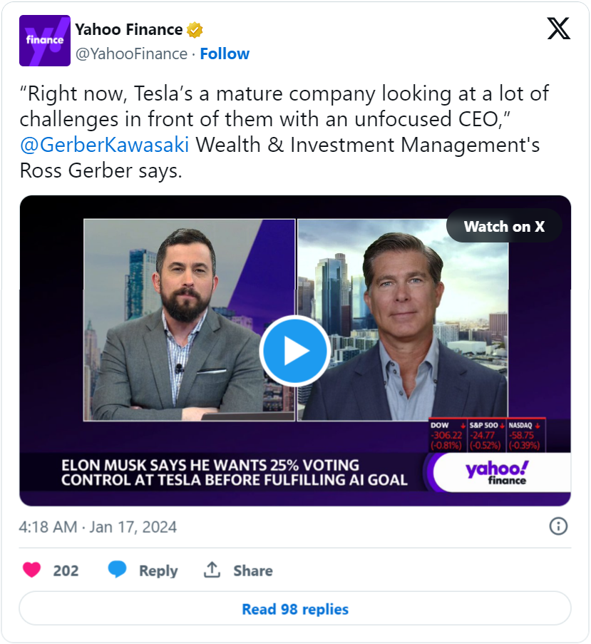 Ross Gerber, President and CEO of Gerber Kawasaki Wealth and Investment Management and a Tesla Inc TSLA investor, reflected on Elon Musk‘s request for a 25% voting stake in the company on Wednesday.