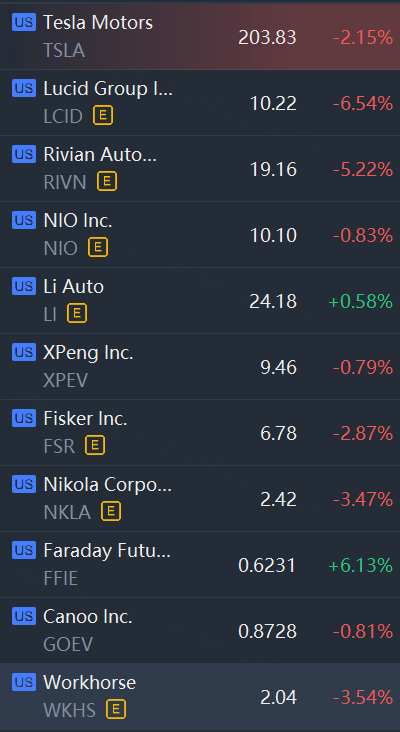 EV stocks dropped in morning trading. Tesla fell 2%; Lucid fell 6%; Rivian fell 5%.