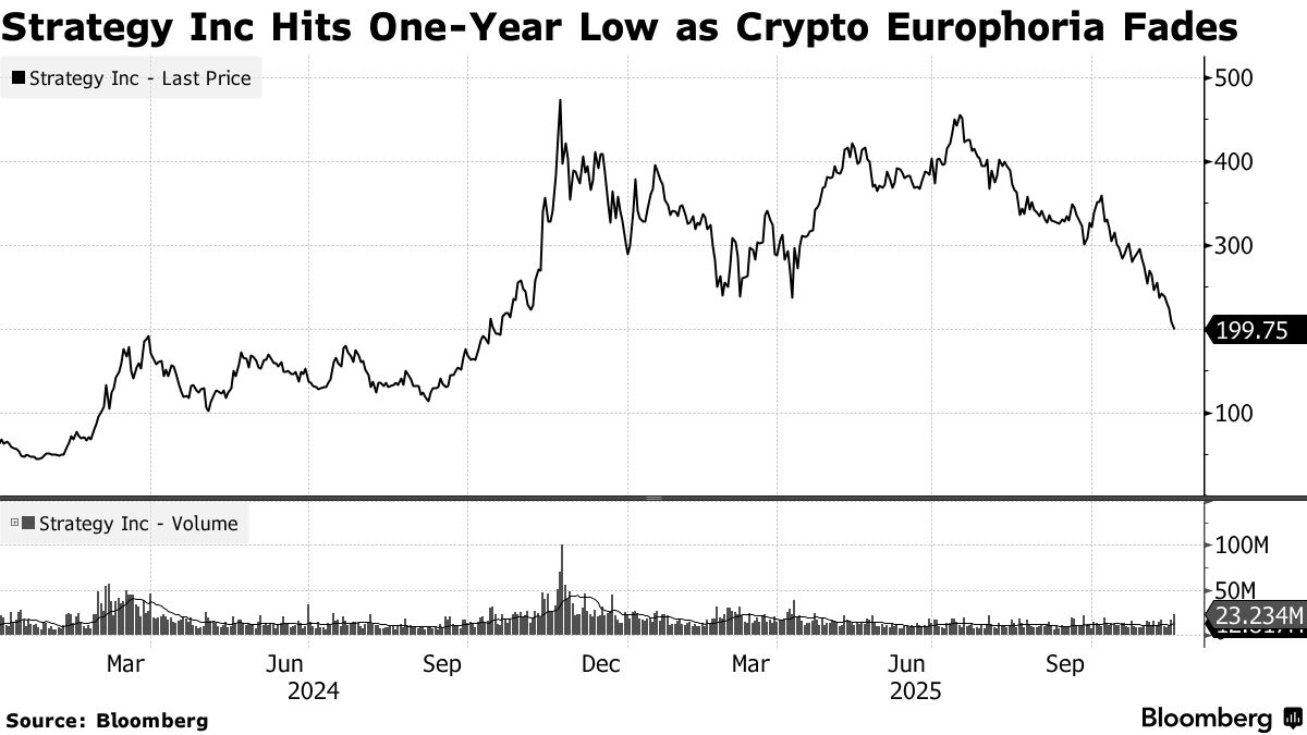 One of the starkest examples of a buying strike in the digital-asset community comes from Michael Saylor’s Strategy Inc., the software firm turned Bitcoin hoarder. Once the poster child for corporate treasury crypto plays, its stock is now flirting near parity to its Bitcoin stash — a sign that investors are no longer willing to pay a premium for Saylor’s high-conviction leverage model.