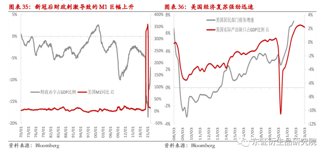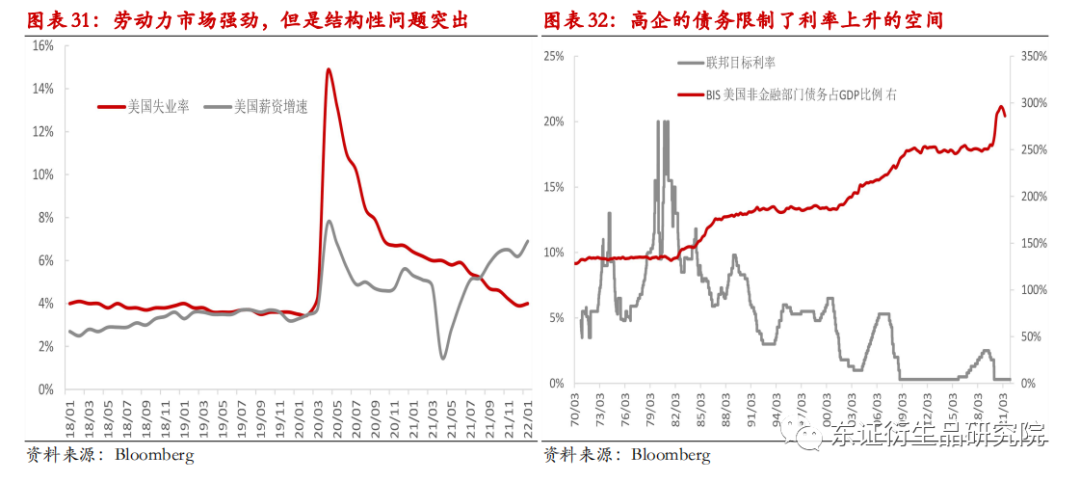 考虑到目前美联储进行了巨量的资产购买,因此整体美国的债务水平相较于上次滞胀阶段有明显的上升,我们并不认为在这种情况下,美联储可以做到加息和通胀的水平相接近。因为这次产出缺口本身的上升主要还是财政政策的结果,因此导致加息力度一旦过高,对于信用利差产生的负面影响将直接对于实体经济形成利空。