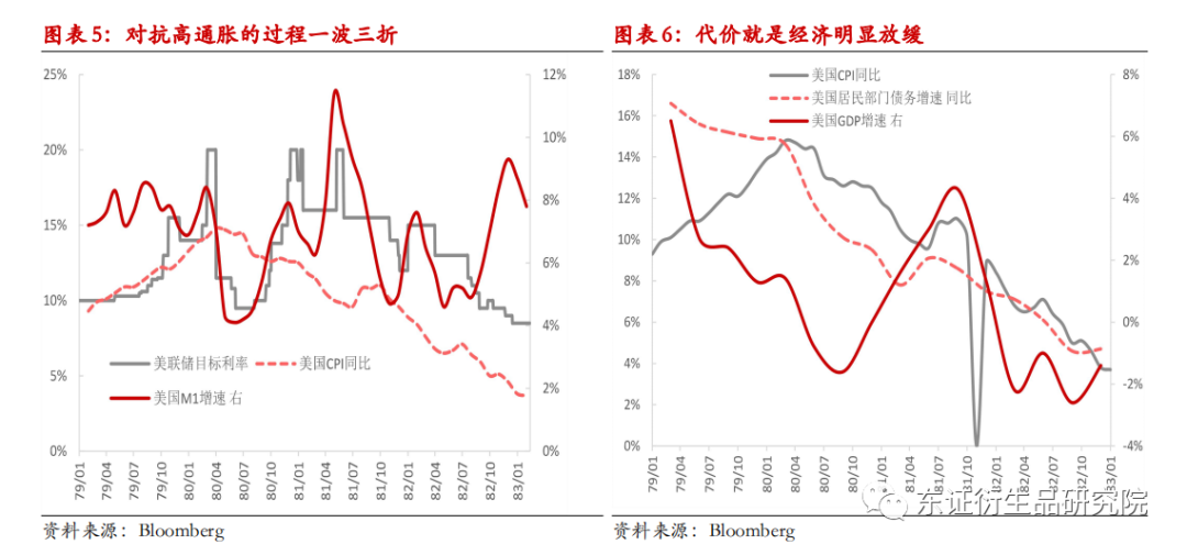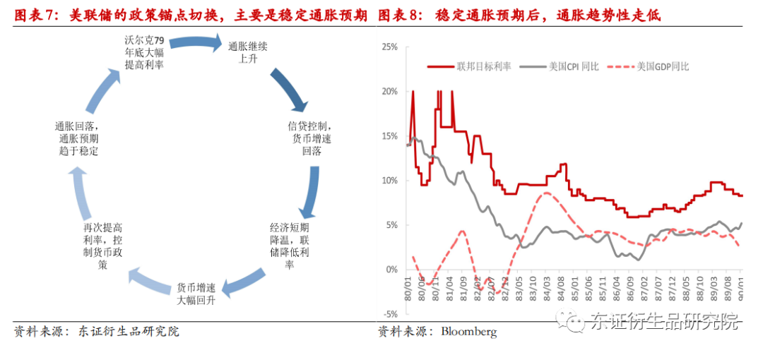 沃尔克开始了针对滞胀的先发制人的加息模式,大幅提高利率来控制通胀预期,经历了非常曲折的加息过程,终于美联储成功控制了通胀预期,并且把美联储的政策锚定变为了稳定通胀预期。