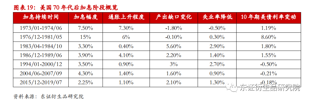 我们在研究了从70年代开始的美联储历次加息后,发现美联储的加息实际上都是对于产出缺口的确认,这个结论非常重要,这意味着美联储的加息政策不可能独立于经济周期存在,美联储加息锚定的产物从货币增速到通胀预期,基本上是按照当时经济周期和推动经济增长的动力来选择。我们不能认为70-80年代在滞胀阶段的加息节奏较慢就认为当时的美联储一定决策失误,主要还是受制于当时的环境和经济形势,可能70-80年代的加息过程就是当时的最优解,虽说沃克尔力挽狂澜,但是美国经济80-90年代度过了黑暗阶段,所谓得失之间,各有不同而已。