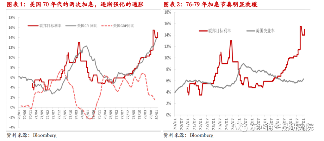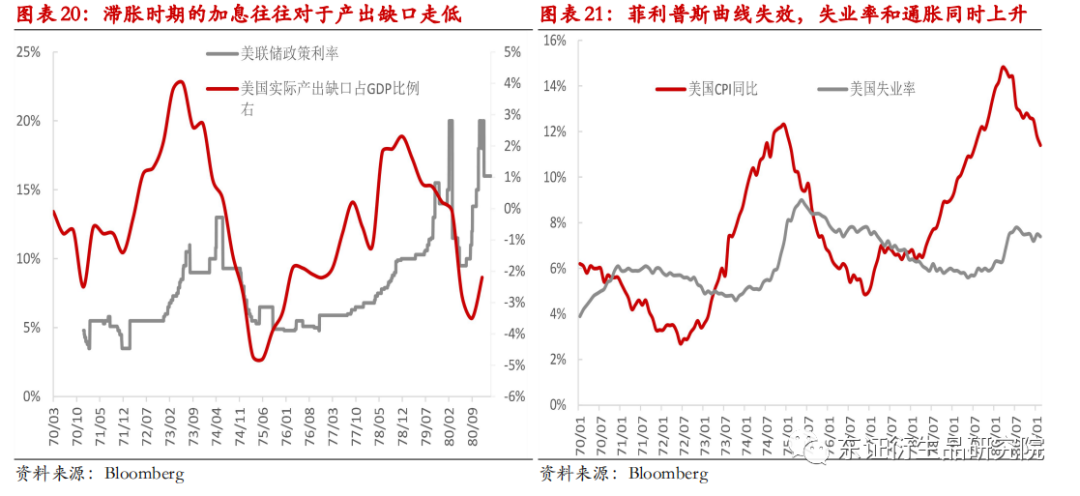 可以类比的就是美国70-80年代滞涨阶段的加息,我们从之前的分析可以看出滞胀阶段的加息基本上分成了两个阶段1)政策滞后于曲线,加息造成通胀预期进一步上升,经济受到负面影响2)通胀水平远高于目标,需要短时间内大幅提高利率来稳定通胀预期。