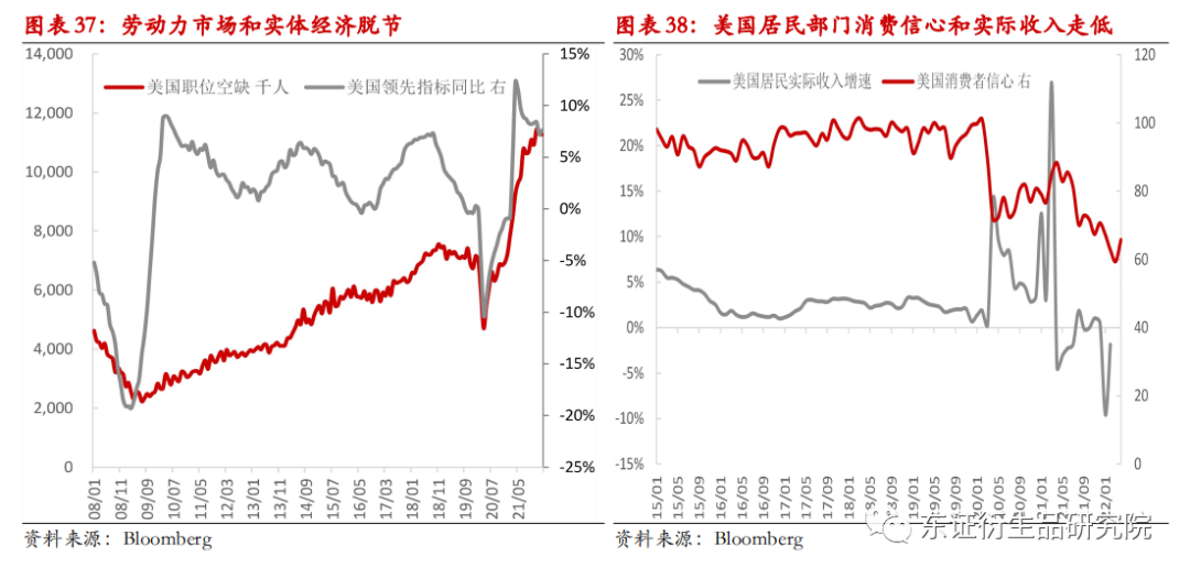 这就造成了一个非常不同于此前阶段的特点,由于本次财政刺激短期规模大,节奏快,因此20年以后美国经济复苏的力度非常高,同时劳动力市场由于疫情原因导致的职位空缺维持高位,这使得在本次加息开始阶段,更加趋向于是一次劳动力市场过热下的加息,但是其他的经济数据已经出现了明显的和劳动力市场不匹配的下行压力,这也就是说,财政刺激带来的经济推动边际递减的速度很快,但是劳动力市场由于疫情的结构因素,并没有直接对于实体经济下行做出有效的反应,而本次美国经济的通胀则作为财政刺激的直接结果,叠加疫情和地缘政治对于供应的影响,其降低的速度明显要弱于实体经济走低的速度。