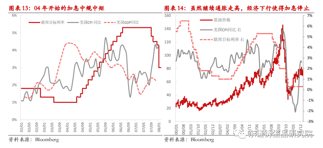 04年开始的加息是在失业率较低,经济增速处于高位开始,直接原因还是通胀持续上升引起的政策变动。04年开始的加息属于非常稳定的持续性加息,值得注意的是加息到07年9月就停止了,加息停止的时间节奏和通胀并非一致,原油价格在08年5月份达到高位,通胀并不是这次美联储加息停止的原因,而是经济形势在07年底出现了明显的走弱倾向,美联储不得不停止加息,那怕通胀实际上还是有上升的压力。实际上居民部门债务水平在加息结束前已经开始走弱,美联储在经济和通胀中选择了经济。