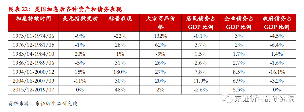另一方面,我们可以分析一下历次加息下美元指数,美国风险资产,大宗商品和各部门债务水平的变化。可以看到,加息往往是对于增长的确认这一点非常明确,大部分的加息阶段,无论是风险资产还是大宗商品,都维持价格增长,除了90年代的加息阶段,美国科技革命导致的强势美元使得股市表现大幅好于大宗商品,以及15年开始的弱势加息,低通胀低增长的加息下大宗表现弱势。相反的是在明显滞胀阶段,大宗商品的表现明显强于商品,因此对于美国经济增长内核的判断依旧是经济增长驱动方式是不是内生性的增长,以及这种增长方式对于通胀的影响,借此来判断实际上在加息确认增长的过程中,股票和商品不同的变化。