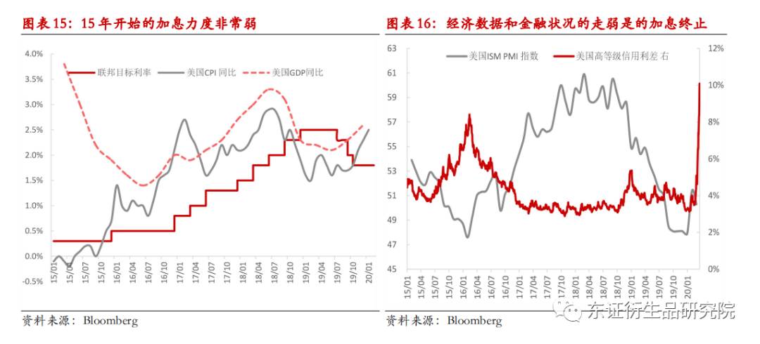 15年开始的加息是美联储在08年全球金融危机后的首次加息,在此之前,美联储向市场进行了足够的预期引导。随着失业率降至低位,通胀开始上升,美联储开始加息,值得注意的是本次加息在16年就遇到了新兴市场尤其是中国的经济大幅放缓,导致美联储不得不放缓加息节奏,直到17年才恢复正常的加息节奏,直到19年美国经济明显走弱之后,美联储不得不停止了加息。
