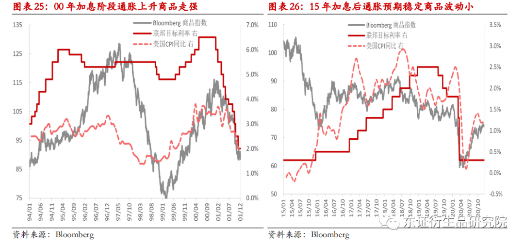 非常值得注意的是大宗商品的走势,我们可以看到,绝大部分阶段,大宗商品的价格在加息过程中都是上涨的,典型的就是70-80年代滞涨加息阶段,和04-07的新兴市场大繁荣导致的大宗商品牛市阶段,即使是在86-89,90-00阶段的加息,面临的并非明显的滞胀,大宗商品价格依旧出现了上涨。大宗商品价格走弱或者下跌的阶段时83-84年的加息和15-19年的加息。