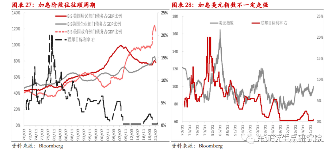 历次加息的过程中,居民和企业债务占GDP的比例大部分阶段都在上升,反倒是政府债务占GDP的比例在降低,因为加息阶段主要是对于增长的确认,因此是顺周期的阶段,居民和企业部门债务占GDP比例在上升,政府债务占GDP比例在降低,加息阶段往往是居民和企业部门债务增速上升,政府债务增速降低的阶段,即使是在滞胀加息阶段,政府部门债务增速相对来说也是降低的,因此不同的加息阶段债务呈现出来的往往具有一致性的特点,但是这并不能代表对于资产价格的影响也一致,美元指数在加息阶段中出现了既有走强也有走弱的状况。